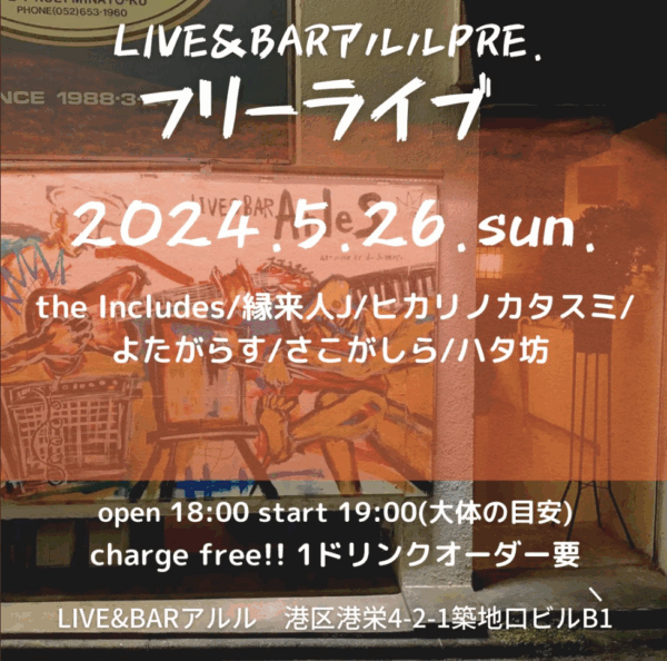 5月26日(日) LIVE &BAR アルル 投稿公開日:2024年4月24日 投稿カテゴリー:未分類 5月26日 フリーライブ @LIVE&BARアルル 日時:2024/5/26(日)場所: LIVE&BARアルルopen 18:00start 19:00頃チャージフリー(1ドリンクオーダー要) <<出演者>>※順不同the Includes縁来人Jヒカリノカタスミよたがらすさこがしらハタ坊 おすすめ 新着情報 2023年5月18日 7月27日(土) the Includes「Aliens 2024 vol.1」 2024年7月30日 10月18日(土) マンスリーライブinなるぱーく 2025年10月8日